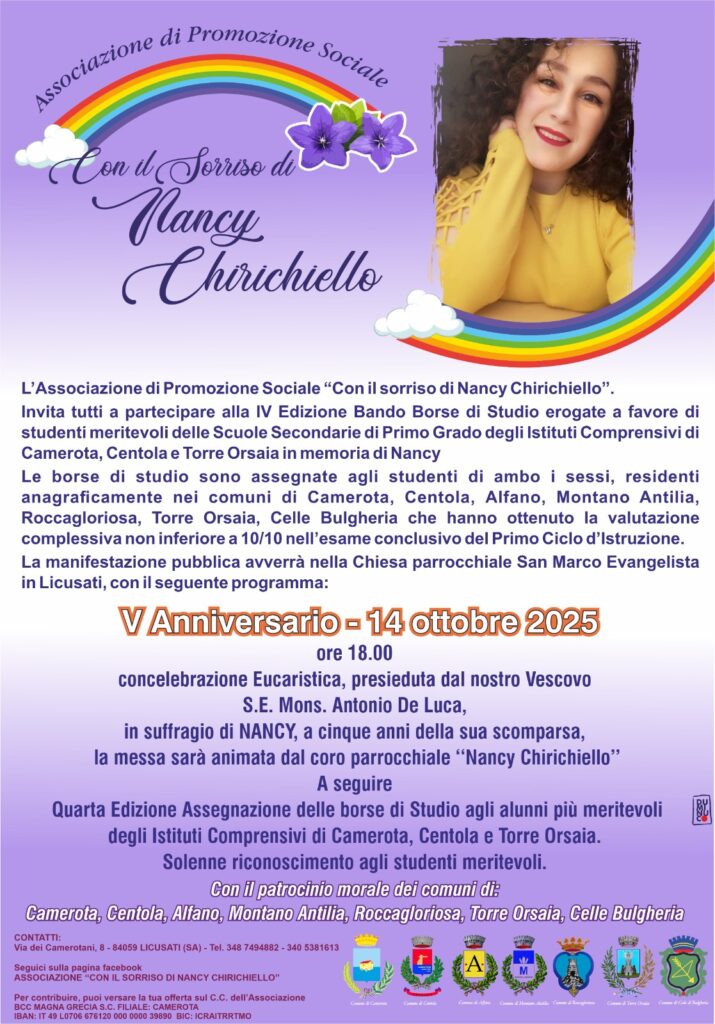 L’Associazione di Promozione Sociale “Con il sorriso di Nancy Chirichiello” celebra il quinto anniversario dalla scomparsa di Nancy con un evento che unisce memoria, fede e solidarietà.