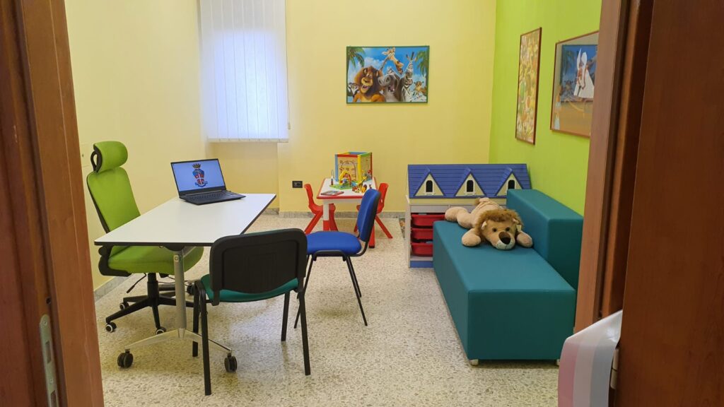La stanza infatti, in linea con i Protocolli Nazionali che regolamentano questo articolato e delicato fenomeno, è stata arredata con i colori ed il calore di una qualsiasi accogliente e familiare abitazione privata, nonché resa ulteriormente funzionale da un vero e proprio “angolo giochi” per i casi di compresenza di figli molto piccoli.