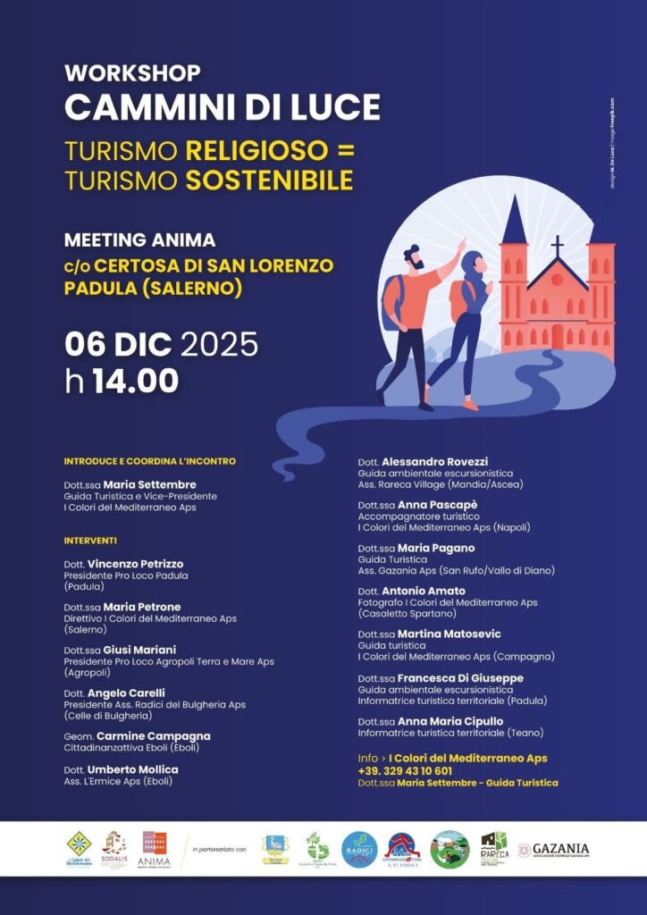 Si terrà il 6 dicembre 2025, alle ore 14.00, presso la suggestiva Certosa di San Lorenzo di Padula (Salerno), il workshop “Cammini di Luce – Turismo religioso = Turismo sostenibile”, un incontro dedicato alla valorizzazione dei percorsi spirituali come motore di sviluppo culturale, ambientale e sociale.