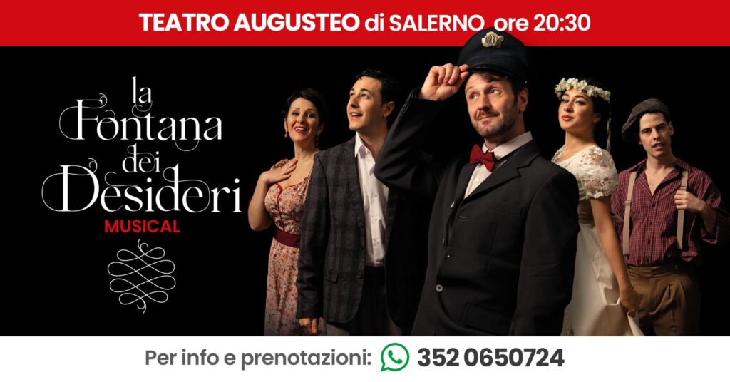 Mercoledi 3 dicembre alle ore 20:30 presso il Teatro Augusteo di Salerno – Piazza Amendola, l’anteprima nazionale del musical “La Fontana dei Desideri”, per sostenere insieme una grande causa. Diciotto gli artisti in scena per un’emozione unica: Ivano Schiavi, Elisabetta D’Acunzo, Gioia Miale, Antonio Speranza, Diego Sommaripa, Benedetta Cenani, Carmelo Cannata, Antonio Corvo, Elisabetta D’Acunzo, Angela Di Santi, Michael Perris, Stefano Ventre, Vincenzo Somma, Ilaria Leone, Valeria Zeno, Raffaella Carleo, Luigi D’Aiello e Ferdinando Flaiello e tanti altri straordinari attori, cantanti e ballerini, per la regia Peppe Miale. L’autore ed il produttore dello spettacolo è Gianluca Vatore.