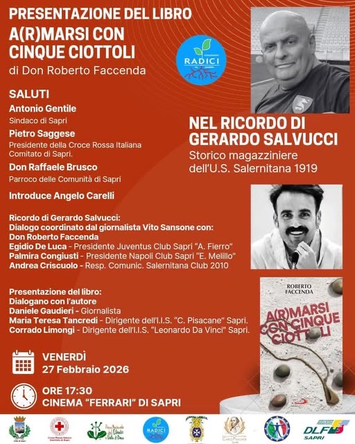 Un evento culturale animerà venerdì 27 febbraio alle 17:30 il Cine-teatro “Ferrari” di Sapri: la presentazione del libro “A(r)marsi con cinque ciottoli”, scritto da Don Roberto Faccenda, parroco e padre spirituale dell’US Salernitana 1919.