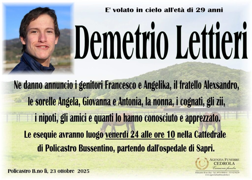 Si terranno venerdì 24 ottobre alle ore 10, nella Cattedrale di Policastro Bussentino, i funerali di Demetrio Lettieri, il giovane di 29 anni deceduto in seguito al tragico incidente in moto avvenuto nei giorni scorsi in località Pantano, nel comune di Policastro Bussentino.