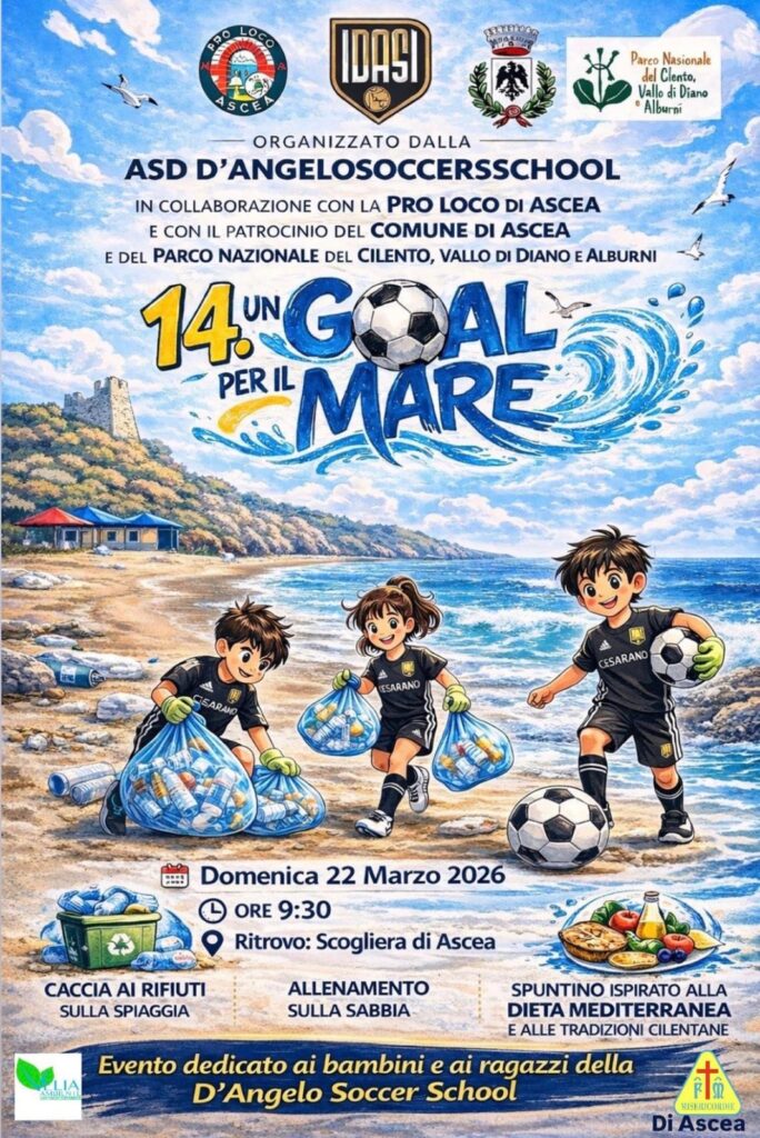 Una mattinata all’insegna dello sport, dell’educazione ambientale e della partecipazione attiva dei più giovani. Si è svolta oggi, domenica 22 marzo, presso la scogliera di Ascea, la 14ª edizione di “Un gol per il mare”, iniziativa che ha visto protagonisti i ragazzi della D’Angelo Soccer School.