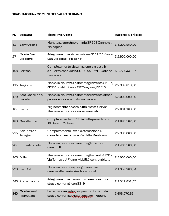 La Regione Campania ha appena approvato interventi per 1 miliardo di euro sul Bando Strade regionali. Nel solo Vallo di Diano questo si traduce in un finanziamento da 33milioni 999mila 546,78 euro su 13 progetti, alcuni dei quali intercomunali.
