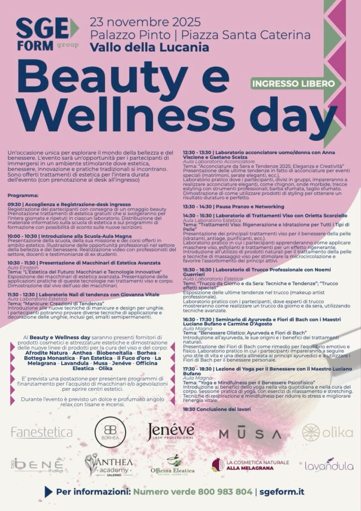 Vallo della Lucania si prepara ad accogliere una giornata interamente dedicata alla cura di sé. Domenica 23 novembre 2025, nelle sale di Palazzo Pinto in piazza Santa Caterina, si terrà il “Beauty e Wellness Day”, evento promosso da SGE Form Group e aperto gratuitamente al pubblico. Un appuntamento pensato per far incontrare estetica, benessere, innovazione e tradizioni olistiche, con la possibilità per i partecipanti di prendere parte a laboratori, dimostrazioni pratiche e trattamenti estetici offerti per l’intera durata della manifestazione.