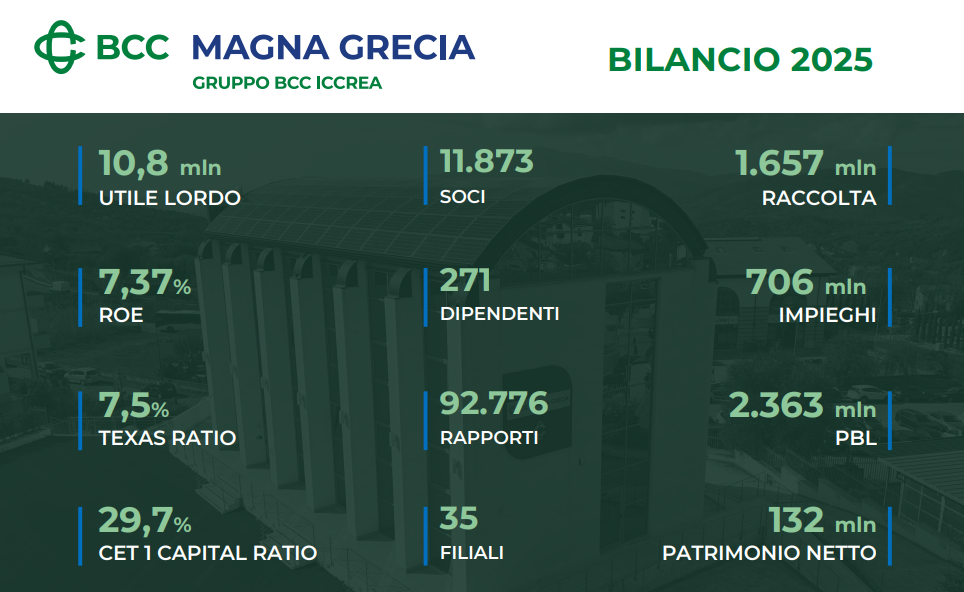 BCC Magna Grecia chiude il Bilancio 2025 con risultati importanti consolidando e confermando la solidità del complessivo quadro tecnico aziendale. In un contesto economico e geopolitico particolarmente complesso la Banca ha portato avanti con determinazione la sua mission di Banca di Credito Cooperativo: creare valore economico, sociale e culturale a beneficio dei soci, clienti e comunità locali.