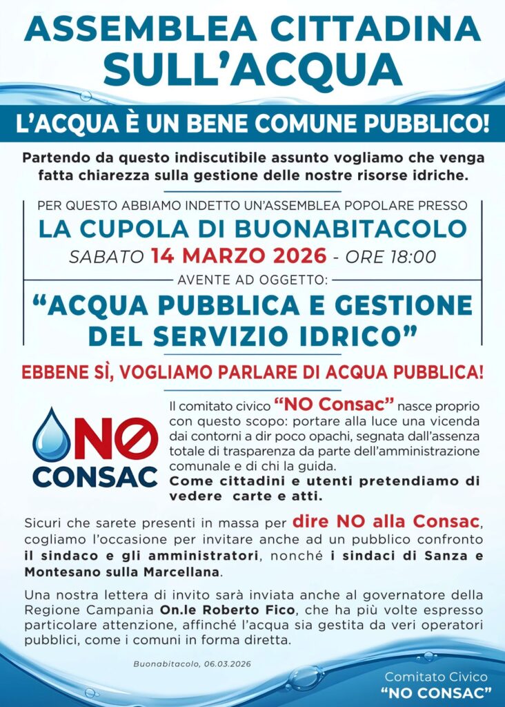 Il Comitato civico “No Consac” ha convocato per sabato 14 marzo, alle ore 18, un’assemblea popolare presso il centro sociale “Cupola” di Buonabitacolo. L’incontro è stato organizzato per illustrare ai cittadini le ragioni della contrarietà alla decisione del sindaco di Buonabitacolo, Giancarlo Guercio, di cedere il servizio idrico comunale al consorzio Consac.