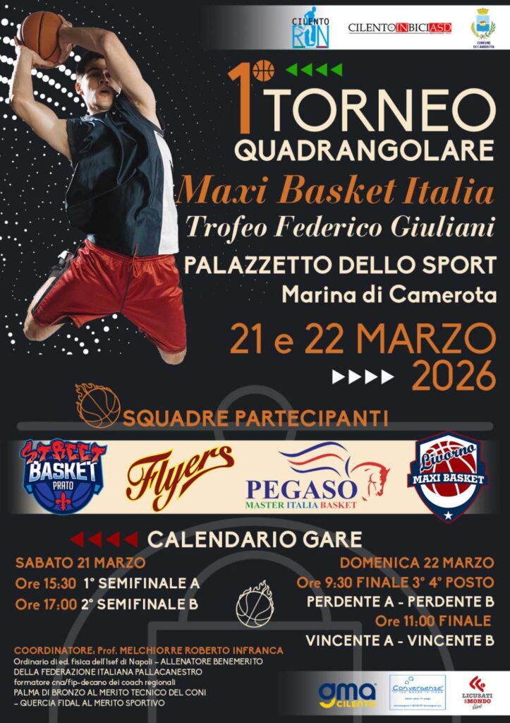 Si è concluso con un grande successo di pubblico e partecipazione il 1° Torneo Quadrangolare Maxi Basket Italia – Trofeo Federico Giuliani, andato in scena sabato 21 e domenica 22 marzo presso il Palazzetto dello Sport di Marina di Camerota. Due giornate intense di sport, passione e sano agonismo che hanno trasformato la struttura in un punto di riferimento per il basket master a livello nazionale.