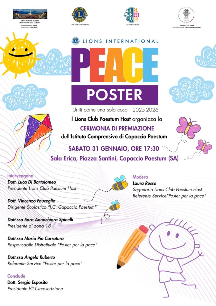 Il Lions Club Paestum Host organizza, sabato 31 gennaio alle 17:30, presso la biblioteca Erica in piazza Santini a Capaccio Scalo, la cerimonia di premiazione POSTER DELLA PACE – “Uniti come una sola cosa” 2025-2026.