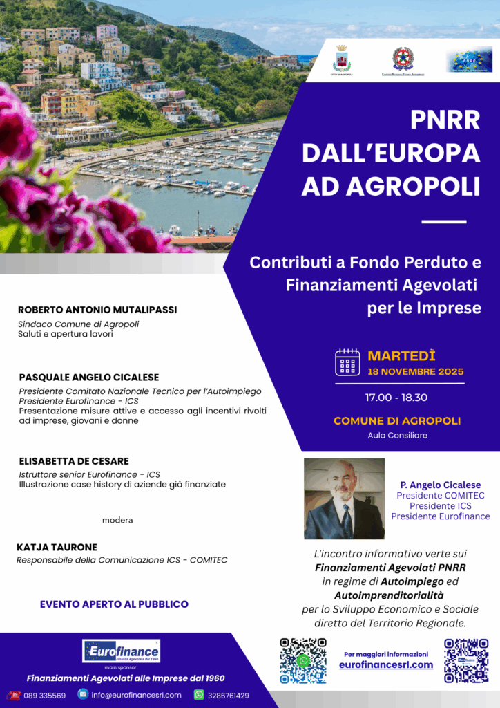 AGROPOLI. Proseguono gli appuntamenti dedicati alla crescita economica dei territori e al sostegno delle imprese attraverso gli strumenti messi a disposizione dallo Stato e dal PNRR. Lunedì 18 novembre, alle 17, l’aula consiliare del comune di Agropoli ospiterà il convegno “PNRR dall’Europa ad Agropoli. Contributo a Fondo Perduto e Finanziamenti Agevolati per le Imprese”, organizzato dal Comitato Nazionale Tecnico per l’Autoimpiego (COMITEC).
