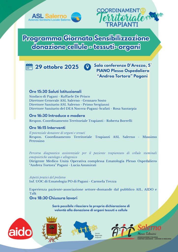 Il Coordinamento Territoriale Trapianti dell’ASL Salerno, in collaborazione con AIDO (Associazione italiana per la donazione di organi, tessuti e cellule) e AIL (Associazione italiana contro le leucemie, linfomi e mieloma), promuove una giornata di informazione e sensibilizzazione dedicata alla donazione di organi, tessuti e cellule.