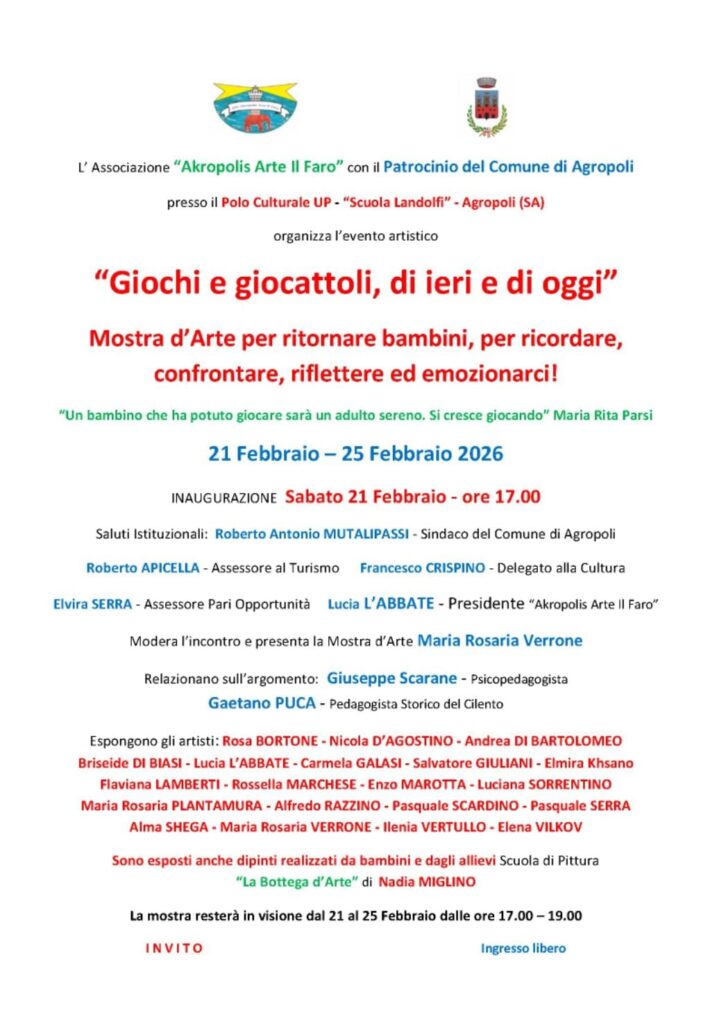 Dal 21 al 25 febbraio 2026, il Polo Culturale UP – “Scuola Landolfi” ospiterà la mostra d’arte “Giochi e giocattoli, di ieri e di oggi”. L’evento, organizzato dall’Associazione “Akropolis Arte Il Faro” con il patrocinio del Comune di Agropoli, si propone come un viaggio emozionale e analitico nel mondo dell’infanzia, per riscoprire il valore profondo del gioco.