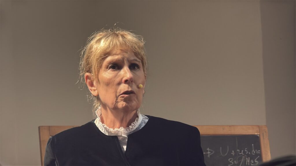 La forza dello spettacolo sta nella sua essenzialità. Sul palco non c’è nulla di superfluo: una lavagna con formule chimiche scritte a mano, frammenti di radio e l’attrice, sola, che diventa Marie Curie, narratrice della propria esistenza.