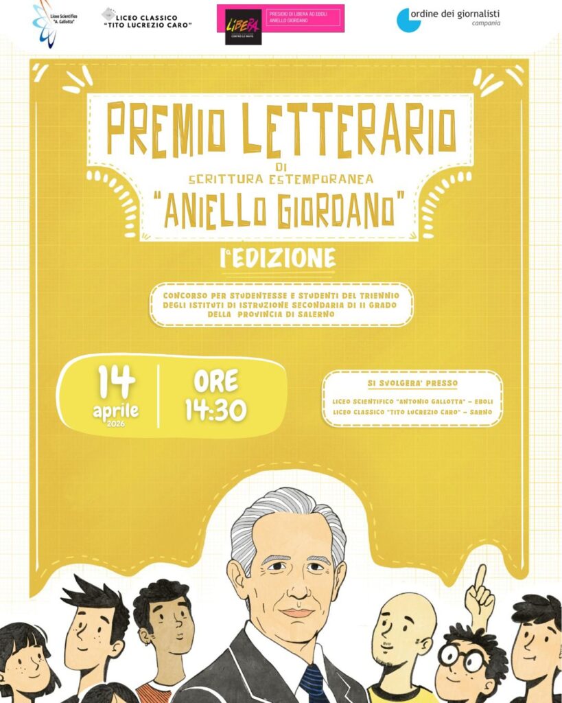 Nasce la prima edizione del Premio letterario di scrittura estemporanea “Aniello Giordano”, promosso da Libera – Associazioni, nomi e numeri contro le mafie, con il Presidio di Libera a Eboli “Aniello Giordano” e i Coordinamenti della provincia di Salerno e della Campania, in collaborazione con il Liceo Scientifico “Antonio Gallotta” di Eboli e il Liceo Classico “Tito Lucrezio Caro” di Sarno, e con il patrocinio dell’Ordine dei Giornalisti della Campania.