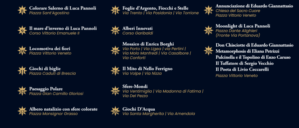 L’accensione avverrà nella Villa comunale, alla presenza del sindaco di Salerno Vincenzo Napoli, dell’amministrazione comunale e del presidente della Regione Campania Vincenzo De Luca, che sostiene l’iniziativa nell’ambito della programmazione artistica e turistica regionale.