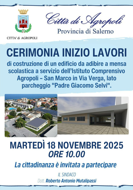 E’ in programma martedì 18 novembre la cerimonia di inizio dei lavori di costruzione di un edificio da adibire a mensa scolastica a servizio dell’Istituto Comprensivo “Agropoli – San Marco”.