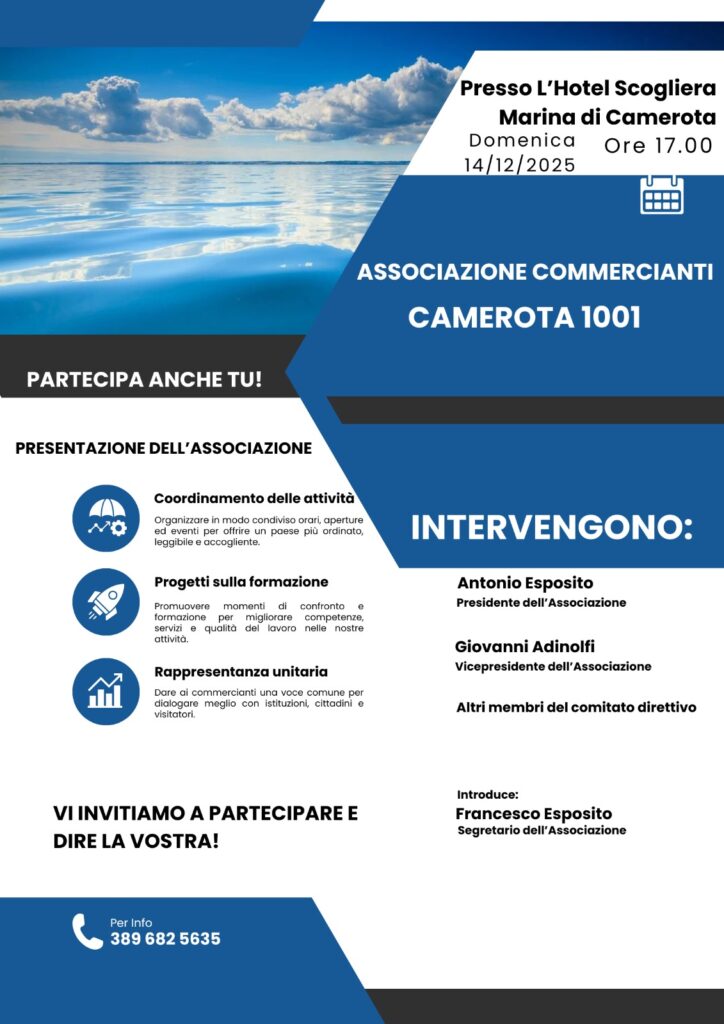 Unire le forze, condividere idee, migliorare servizi e instaurare un dialogo costante con istituzioni e cittadini. Sono questi gli obiettivi della nuova Associazione Commercianti Camerota 1001, che sarà presentata ufficialmente domenica 14 dicembre 2025, alle ore 17, presso l’Hotel Scogliera di Marina di Camerota.