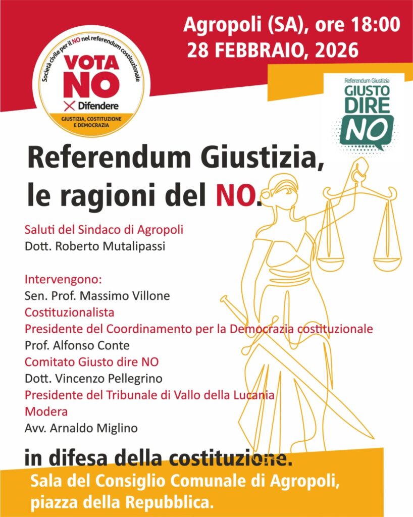 Sabato 28 febbraio 2026, alle ore 18:00, la Sala del Consiglio Comunale di Agropoli ospiterà un importante incontro pubblico dal titolo “Referendum Giustizia, le ragioni del NO”. L’evento, promosso dal comitato “Società civile per il NO nel referendum costituzionale”, mira ad approfondire le criticità della riforma della magistratura in vista del voto popolare previsto per il 22 e 23 marzo.