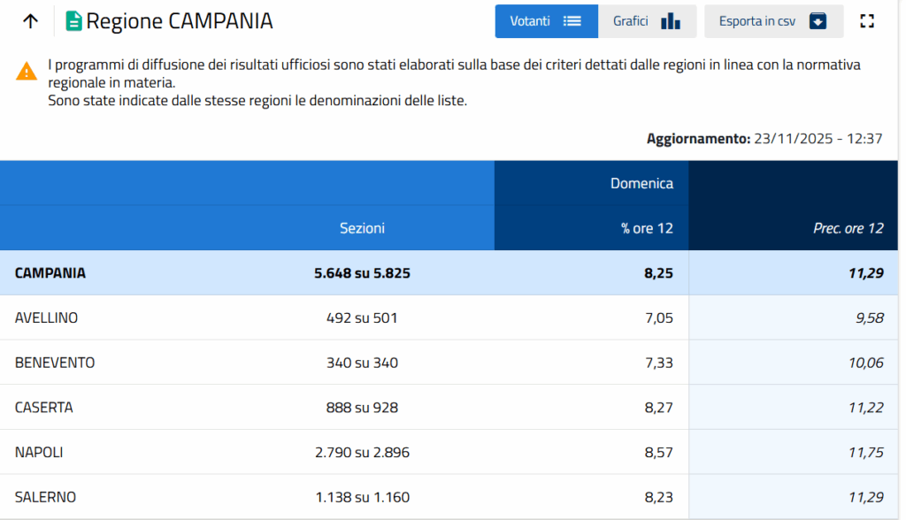 Affluenza in diminuzione alle urne per le elezioni regionali in Campania. Poco dopo le ore 12, secondo i dati del Viminale relativi alle 5.825 sezioni, ha votato l’8,25% degli aventi diritto. Un dato sensibilmente più basso rispetto al 2020, quando alla stessa rilevazione l’affluenza era stata dell’11,28%.