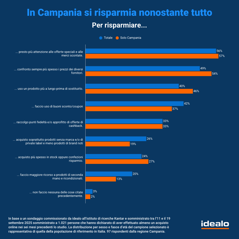 Le strategie per il contenimento delle spese nel quotidiano sono principalmente orientate alla ricerca di offerte speciali e prodotti scontati: quasi 6 intervistati su dieci (57%) dichiarano di essere molto attenti alle offerte speciali e alle merci scontate, con il 54% che considera il confronto prezzi come un elemento centrale della propria strategia di risparmio, percentuale più alta rispetto alla media nazionale.