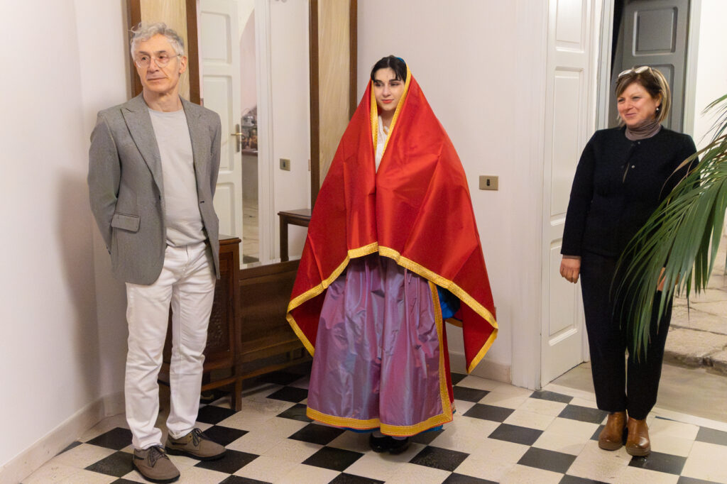In occasione della Residenza artistica dell’Accademia di Belle Arti di Roma, la settimana scorsa è stata documentata e registrata integralmente la procedura di vestitura dell’abito, al fine di conservarne la memoria. Il procedimento è stato ampiamente illustrato dal Professore Tortorella all’interno del Palazzo Albirosa. Si ringrazia il Dottor Antonio Federico e consorte per la preziosa ospitalità, e in particolare Emanuela Metitieri che si è prestata come modella a indossare l’abito.