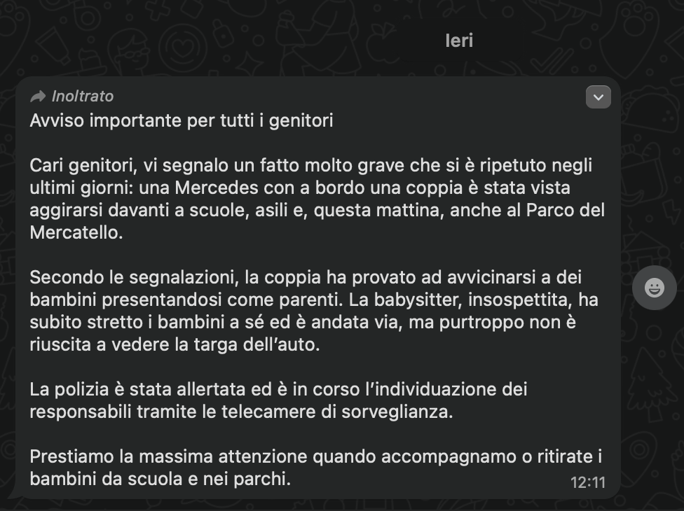 «Una Mercedes con a bordo una coppia è stata vista aggirarsi davanti a scuole, asili e, questa mattina, anche al Parco del Mercatello. La coppia ha provato ad avvicinarsi a dei bambini presentandosi come parenti».