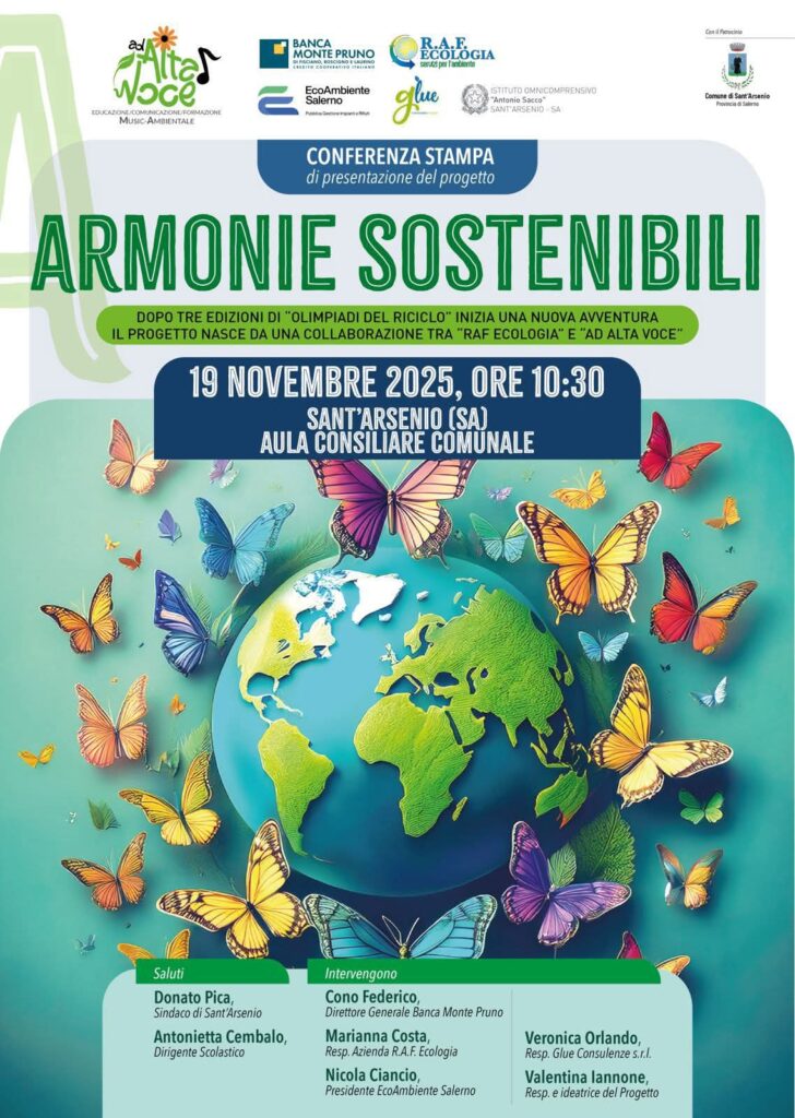 Un nuovo progetto dedicato all’educazione ambientale e alla sensibilizzazione delle giovani generazioni ha preso ufficialmente il via a Sant’Arsenio. Mercoledì, 19 Novembre, alle 10.30, nell’Aula Consiliare del Comune, si terrà la conferenza stampa di presentazione di “Armonie Sostenibili”, iniziativa che segna l’inizio di una nuova fase dopo il successo delle tre edizioni delle Olimpiadi del Riciclo.